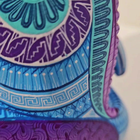 This wooden sculpture, El Chameleon embodies flexibility and seeing things from different perspectives. Carved and painted by hand, this piece incorporates Zapotec codices and grecas (geometric patterns) that reflect cultural memory and spiritual insight. A unique piece that brings contemporary artistry and cultural heritage into any space.