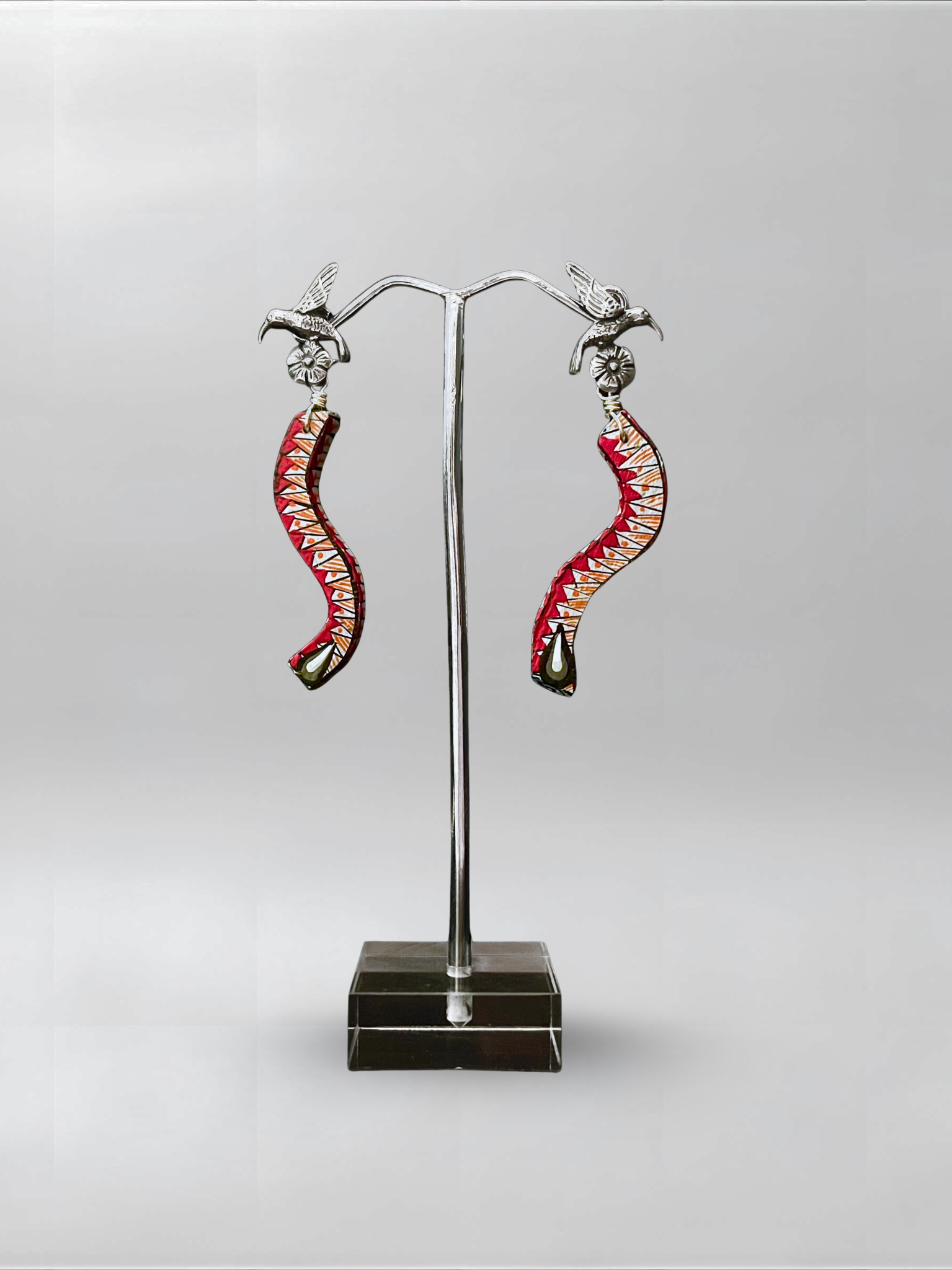 This sleek linear design features a 0.925 silver hummingbird stud and hand-painted Zapotec symbols. The house represents protection, the mountain signifies greatness, and the labyrinth symbolizes the search for life’s path. A bold fusion of cultural storytelling and contemporary elegance.