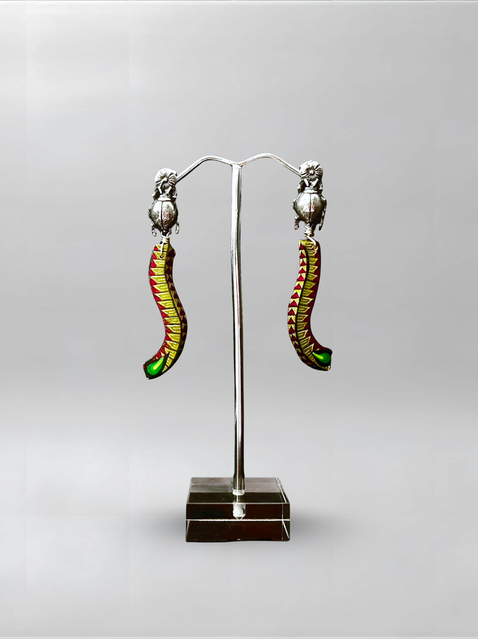 This green and purple linear earring is anchored by a 0.925 silver beetle stud. Painted Zapotec motifs of a house bring a sense of safety and comfort, while the labyrinth encourages curiosity and exploration. A piece that inspires confidence and adventure in everyday life.