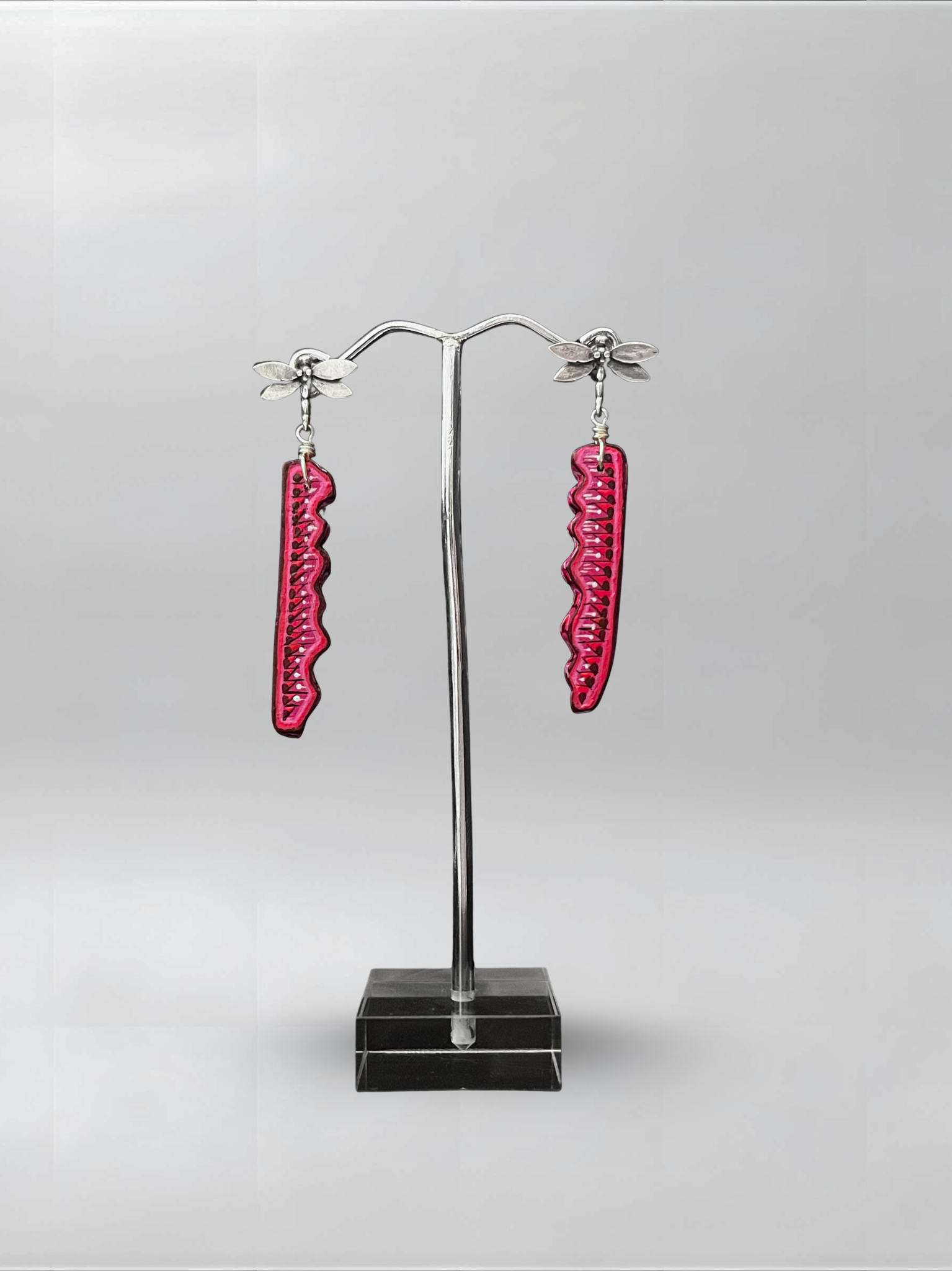 These linear pink earrings feature a 0.925 sterling silver dragonfly stud with a hand-painted Zapotec house motif, symbolizing protection and home. Combining vibrant color with artisan craftsmanship, they are a meaningful and playful statement piece for everyday wear.