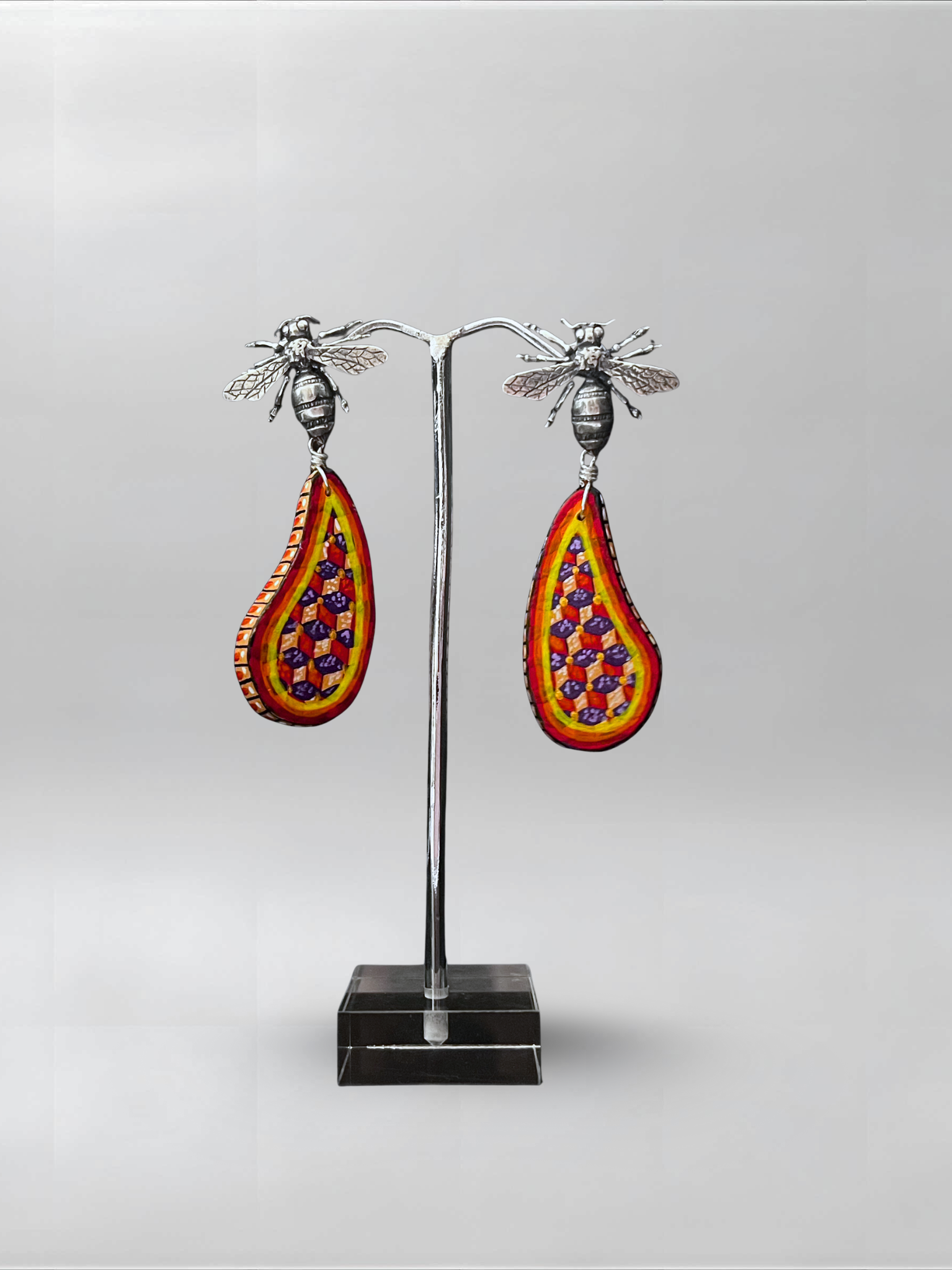 These red, purple, and orange linear earrings feature a 0.925 sterling silver bee stud adorned with hand-painted Zapotec symbols—a butterfly representing happiness and figures symbolizing community. Designed to celebrate joy and connection, each artisan-crafted piece adds color and charm to your everyday style.
