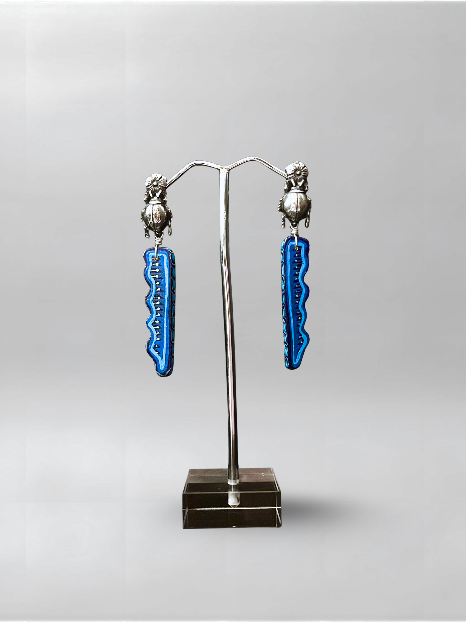 These blue linear earrings feature a 0.925 sterling silver beetle stud, hand-painted as a protector motif. Artisan-crafted with clean lines and calming tones, these earrings are designed to inspire a sense of safeguarding and personal strength.