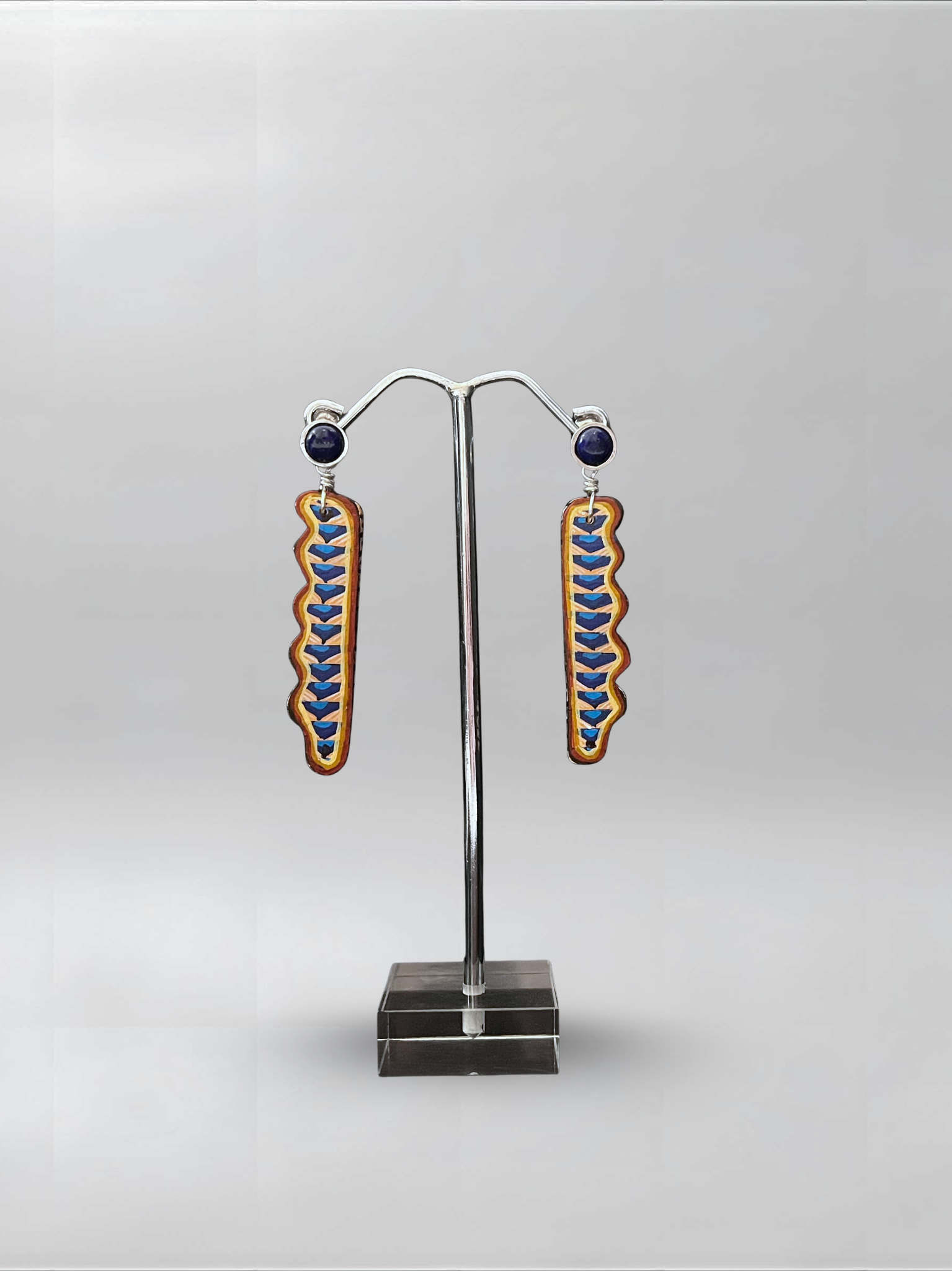 These blue and brown linear earrings feature a 0.925 sterling silver stud set with a natural lapis lazuli stone, hand-painted with a Zapotec search symbol. Artisan-crafted with earthy tones and clean lines, these earrings are designed to inspire curiosity, exploration, and personal discovery.